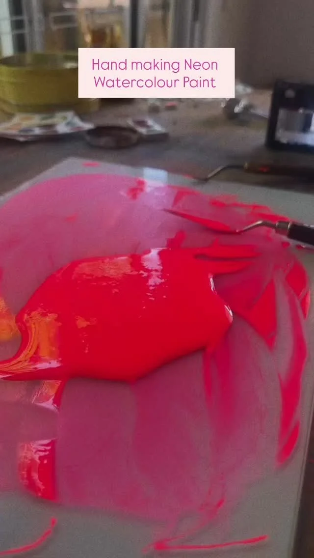 the image shows a hand painting with a freshly made batch of shimmery blue watercolour. the background is filled with the tools needed to make the paint on a simple wooden table.