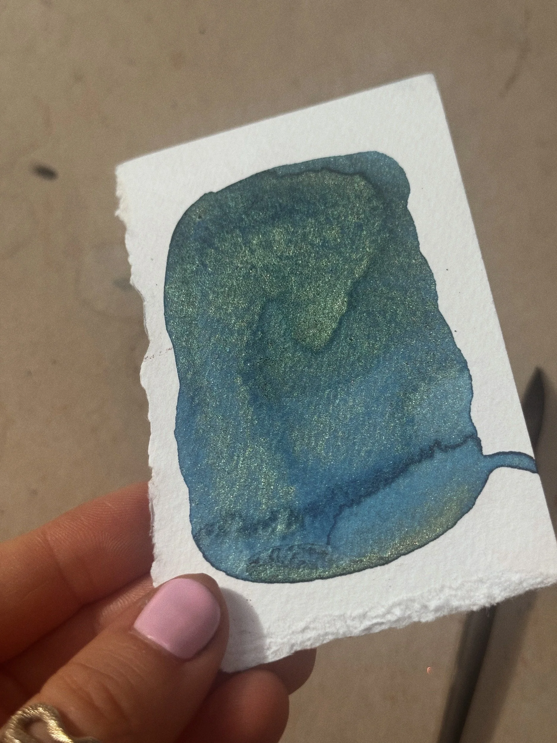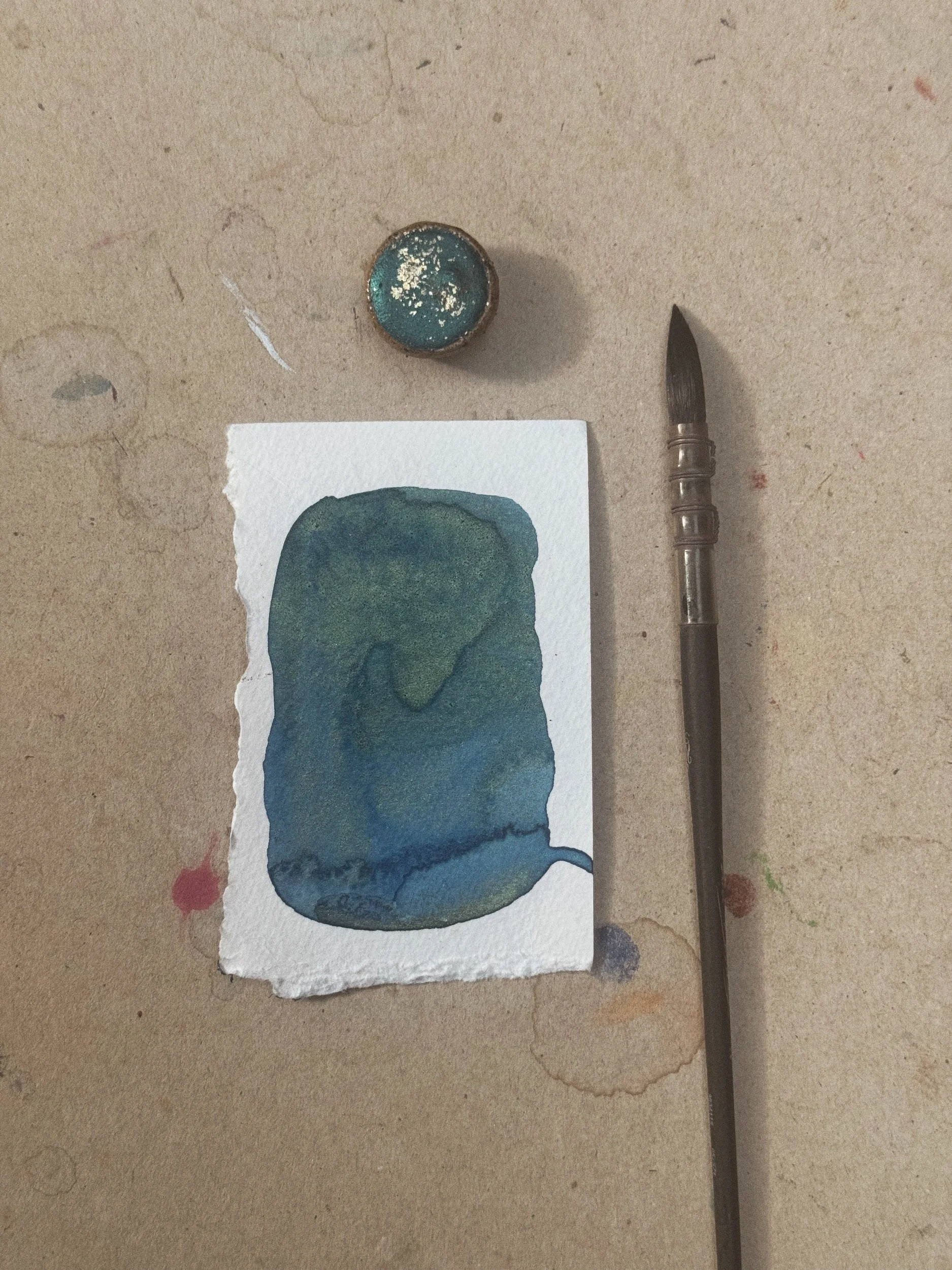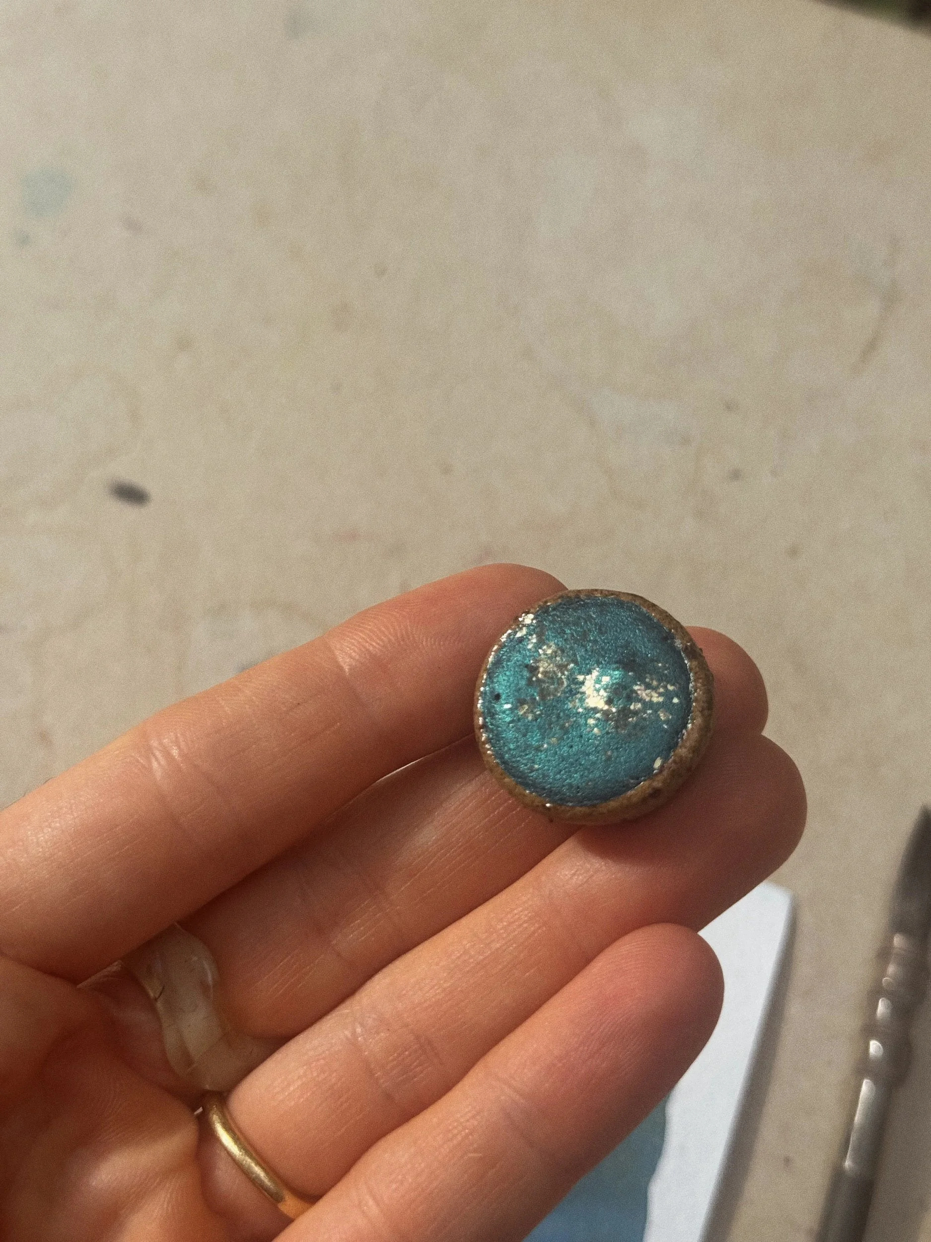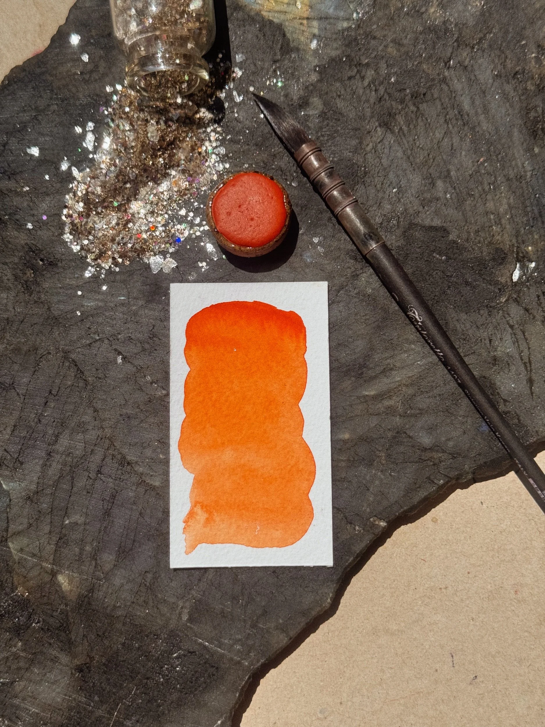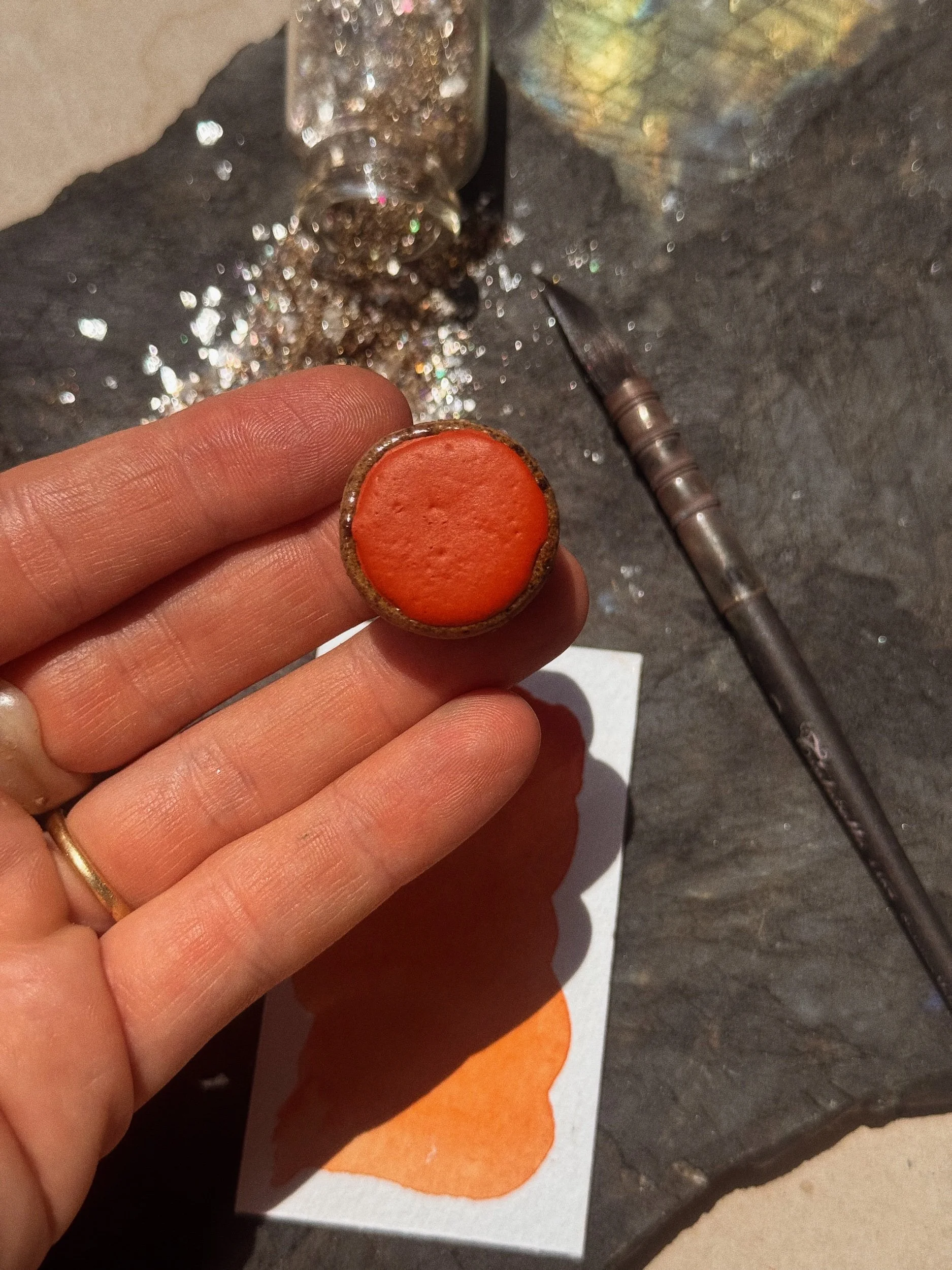 This tan speckled paint pot is standard sized and clear glazed making it entirely reusable. It has our handmade colour Marigold poured inside from the Prairie Whispers collection of colours. It is single pigmented, granulating and opaque. It is a more muted and earthy yellow. Contains roughly a half pans worth of paint.