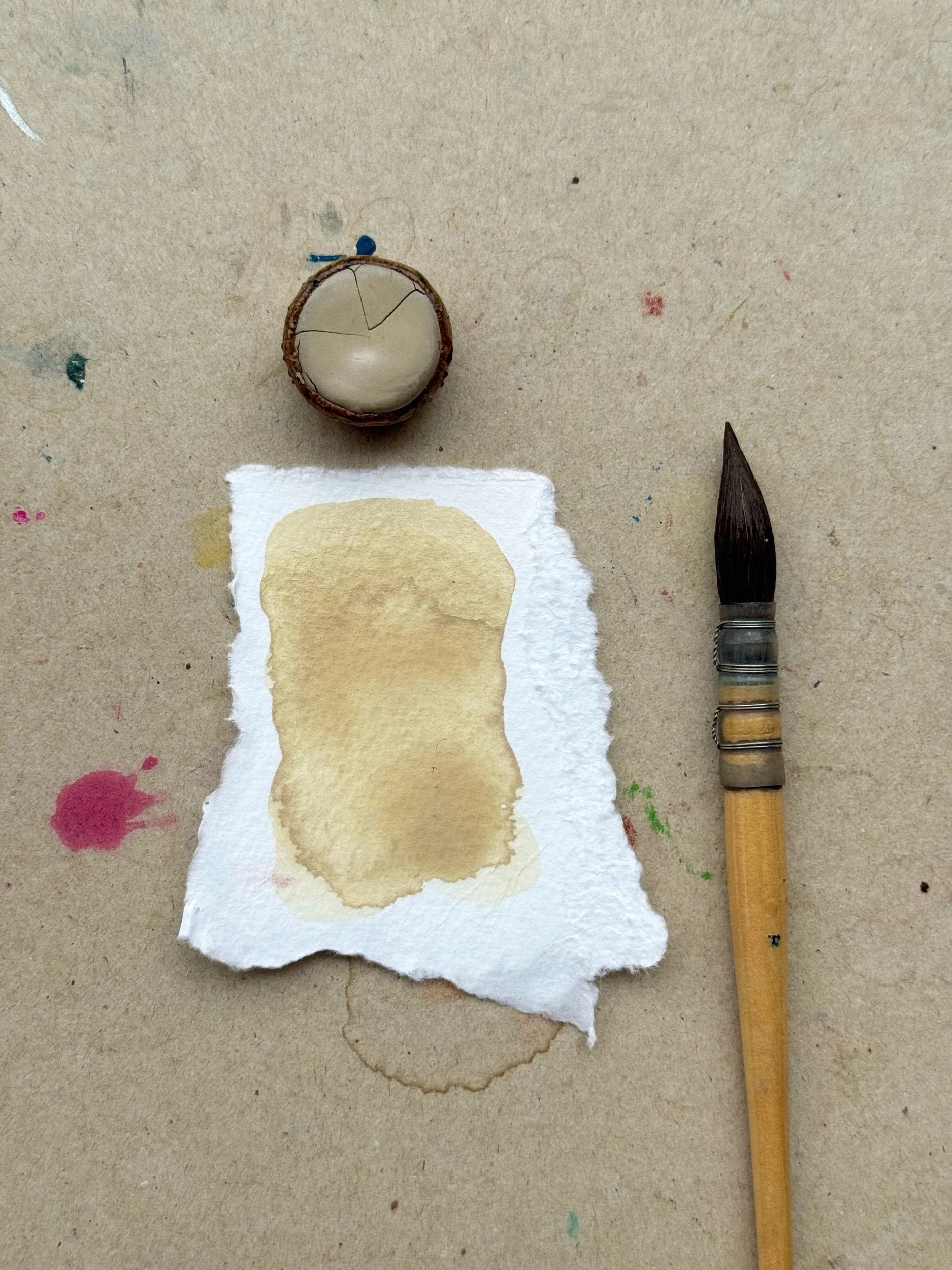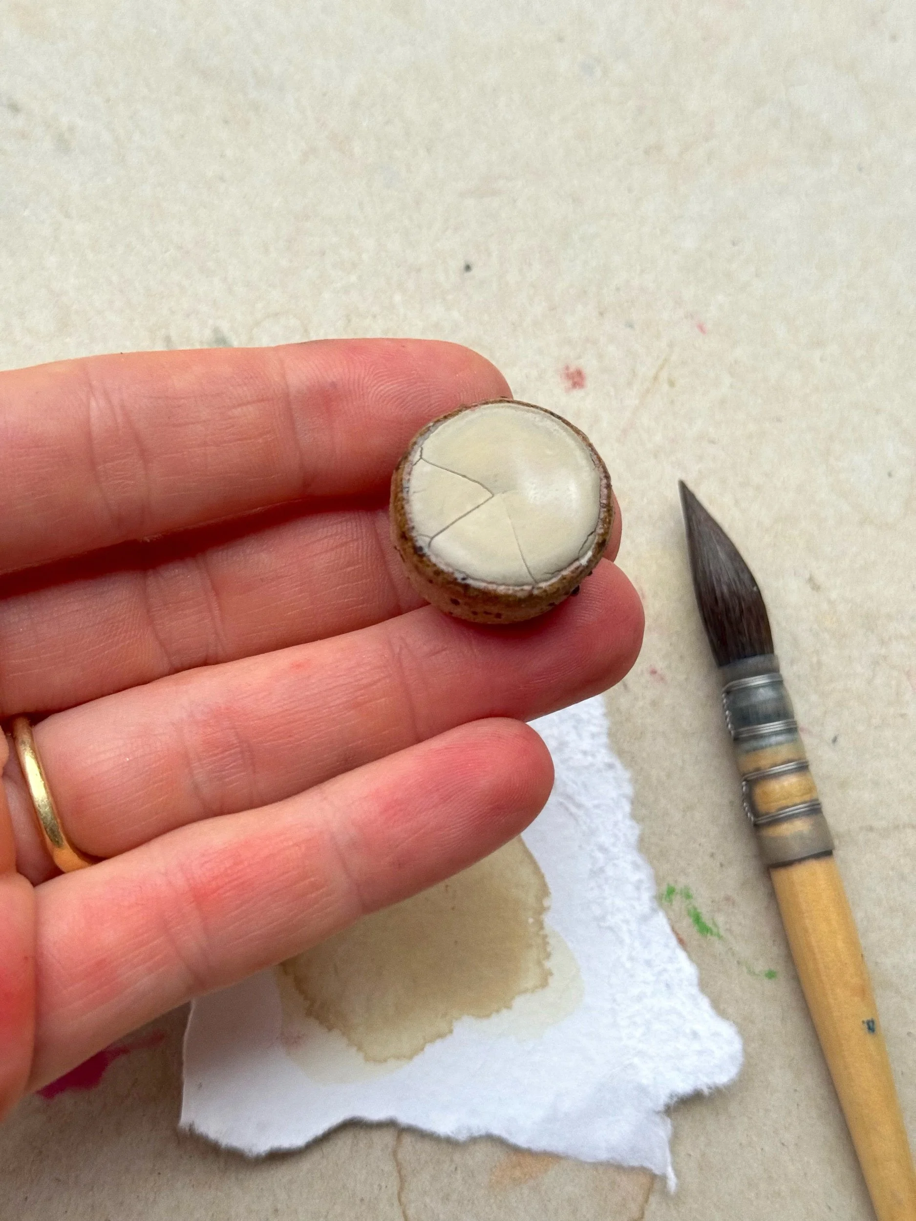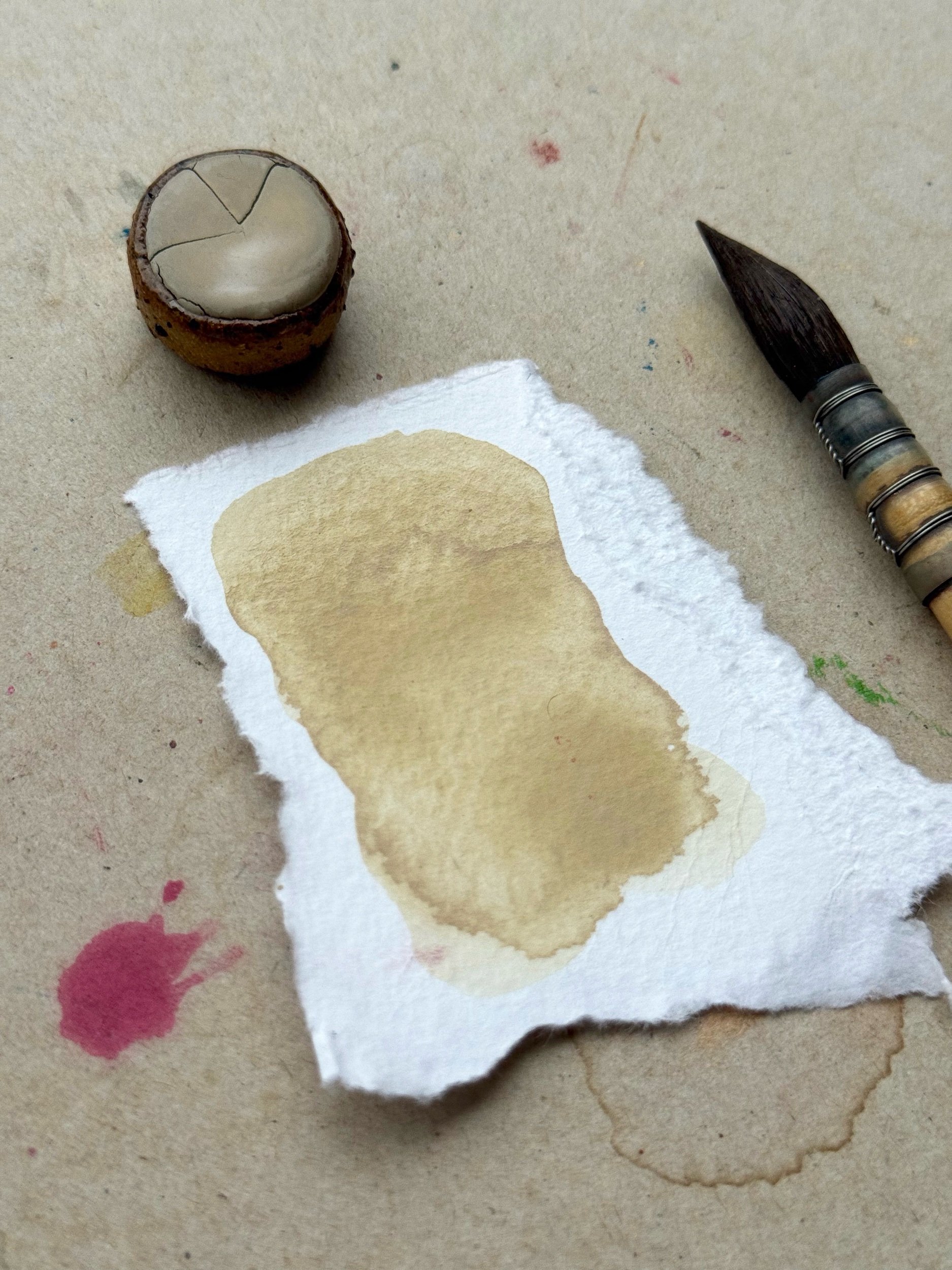 A single handmade ceramic paint pan with my handmade colour Buff. Contains approximately a half pan worth of paint. It is a single pigment, that is lightfast, granulating and opaque.