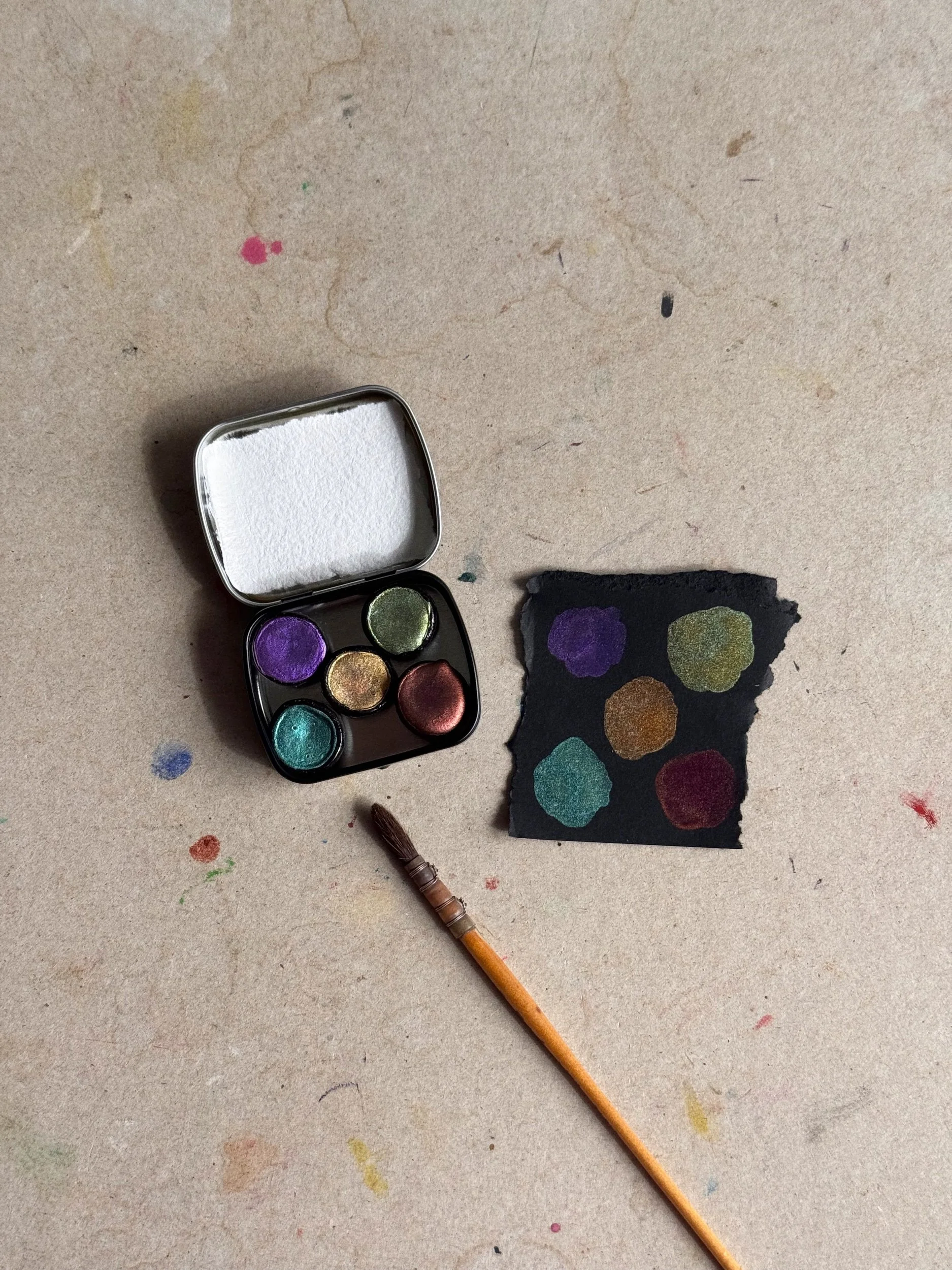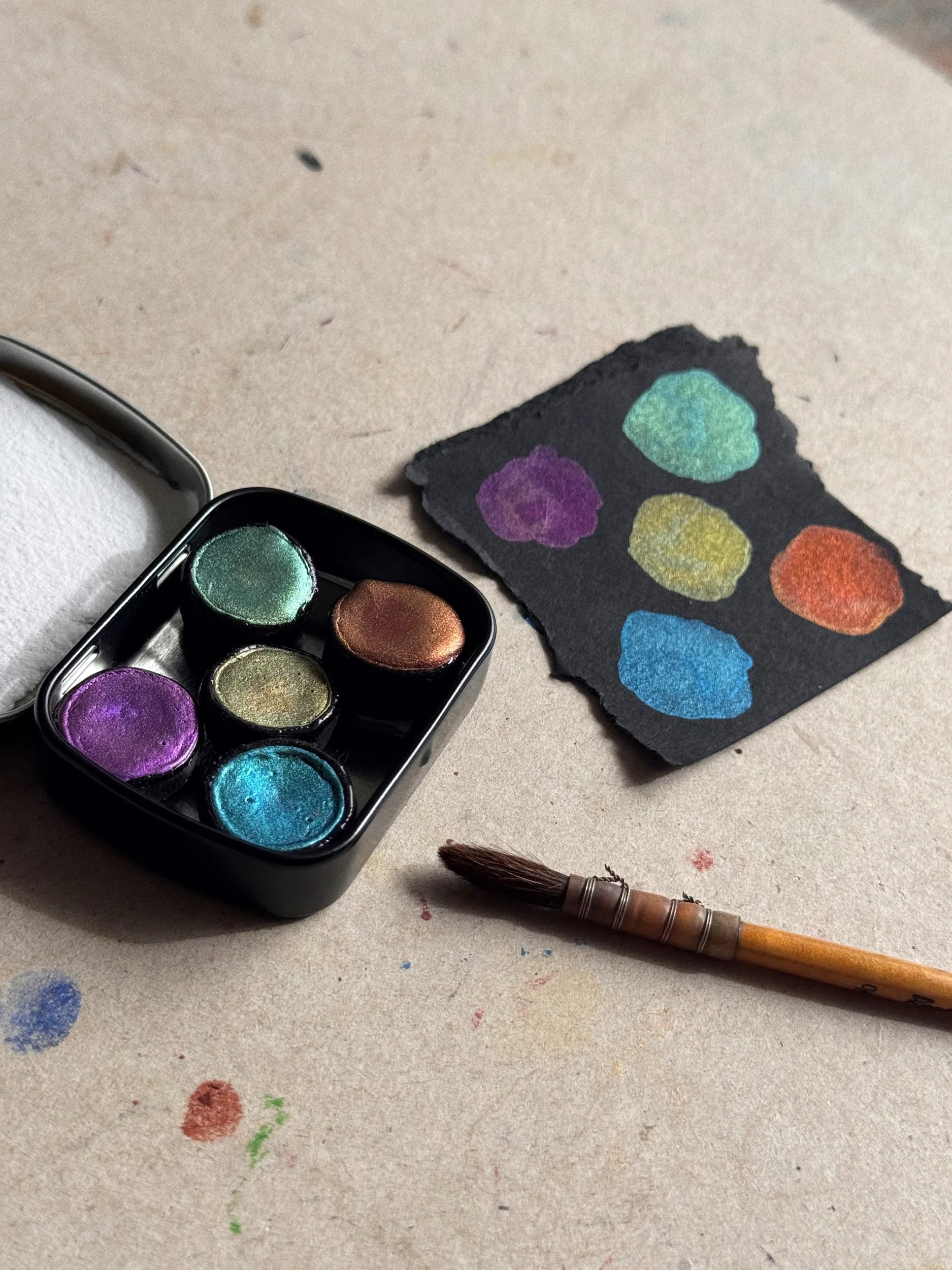 This set of 5 Japanese duochrome mica paints are super easy to activate and have a creamy texture and smooth brushfeel. They each throw multiple colours depending on the light and are used on black watercolour paper for best results.