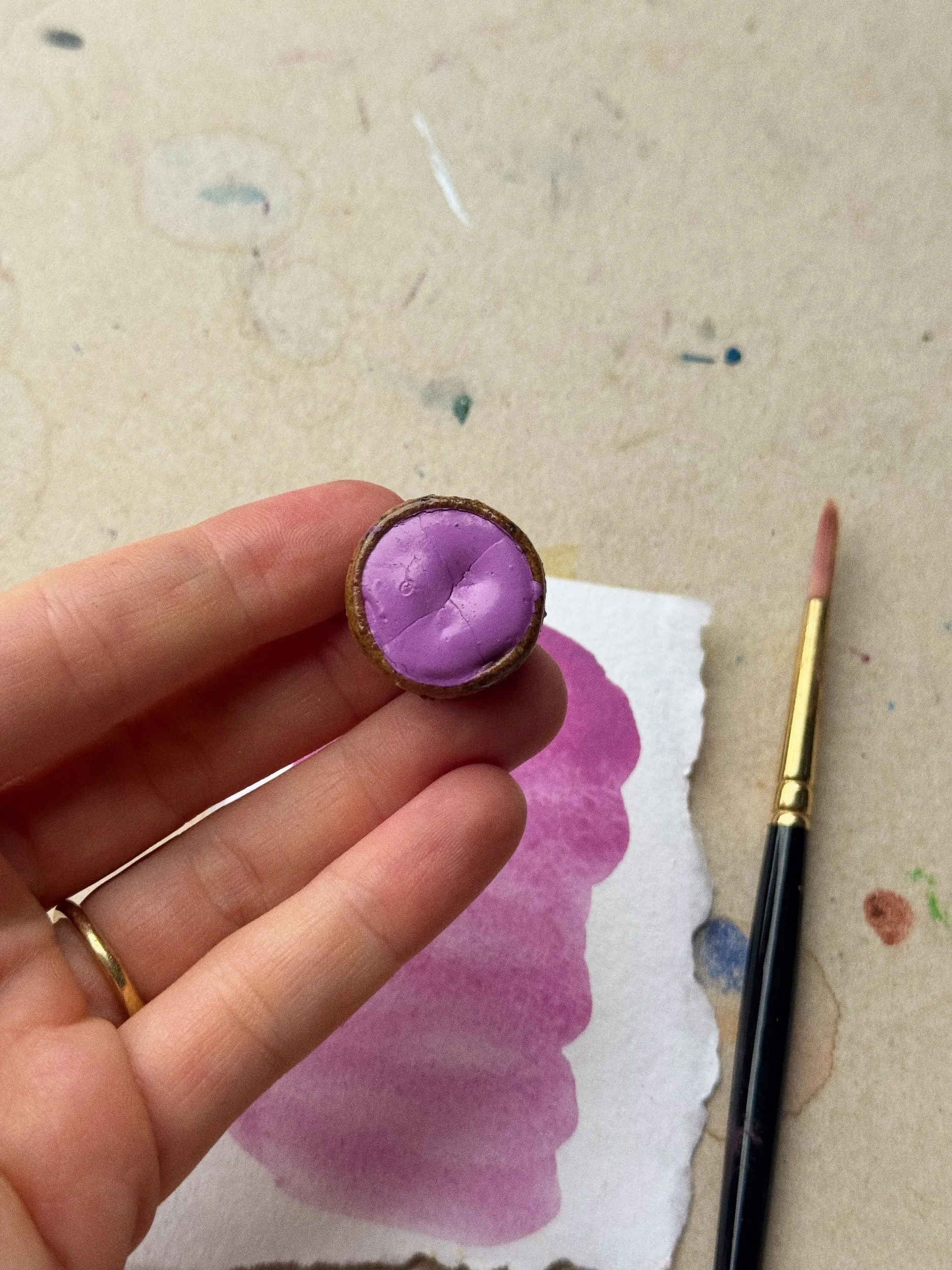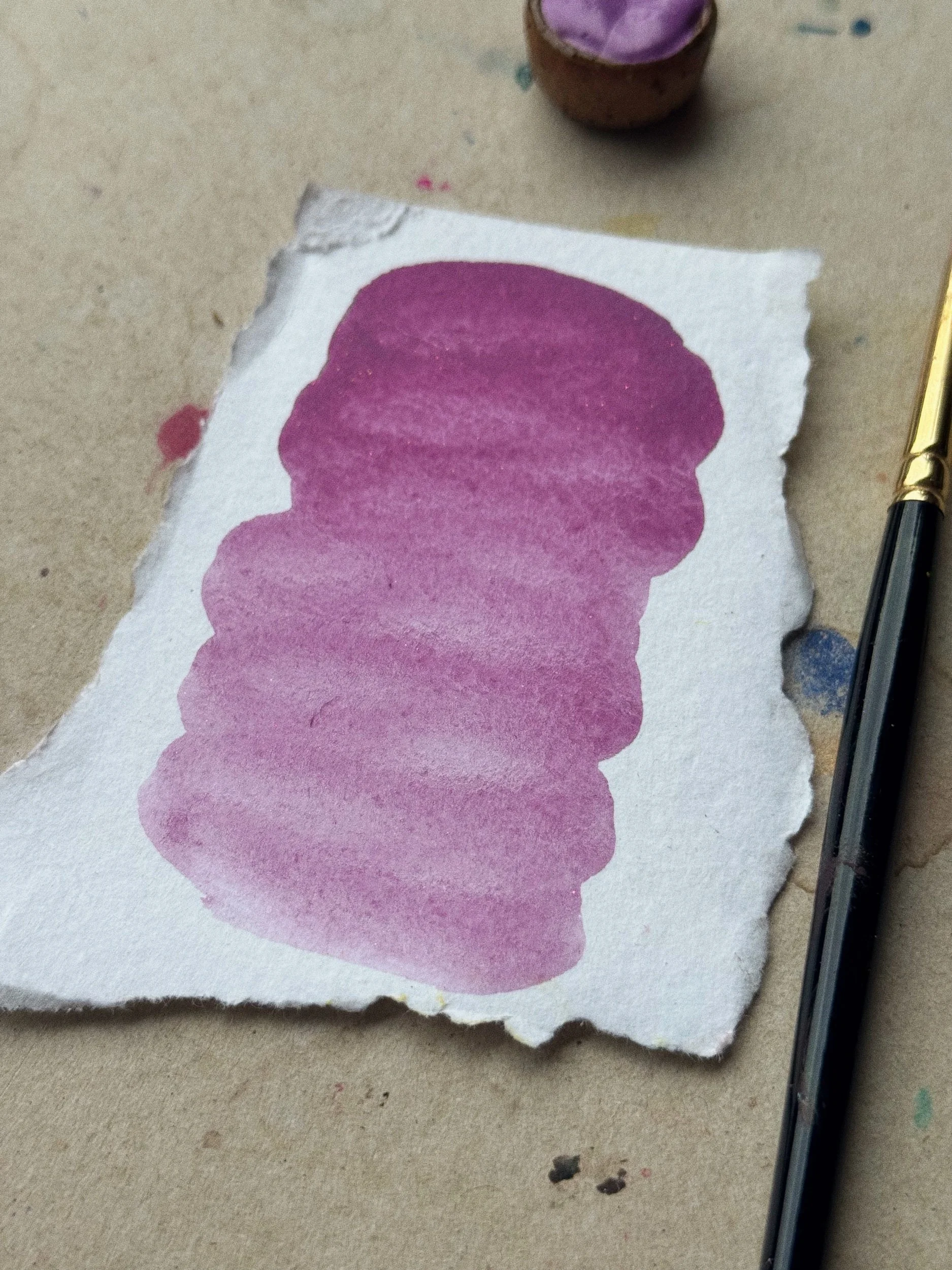 This exclusive Ruco blend is called Calliope. It is opaque, granulating and lightfast. Carefully poured in layers into a tan speckled ceramic paint pot, this colour contains approximately a half pans worth of paint (or more).