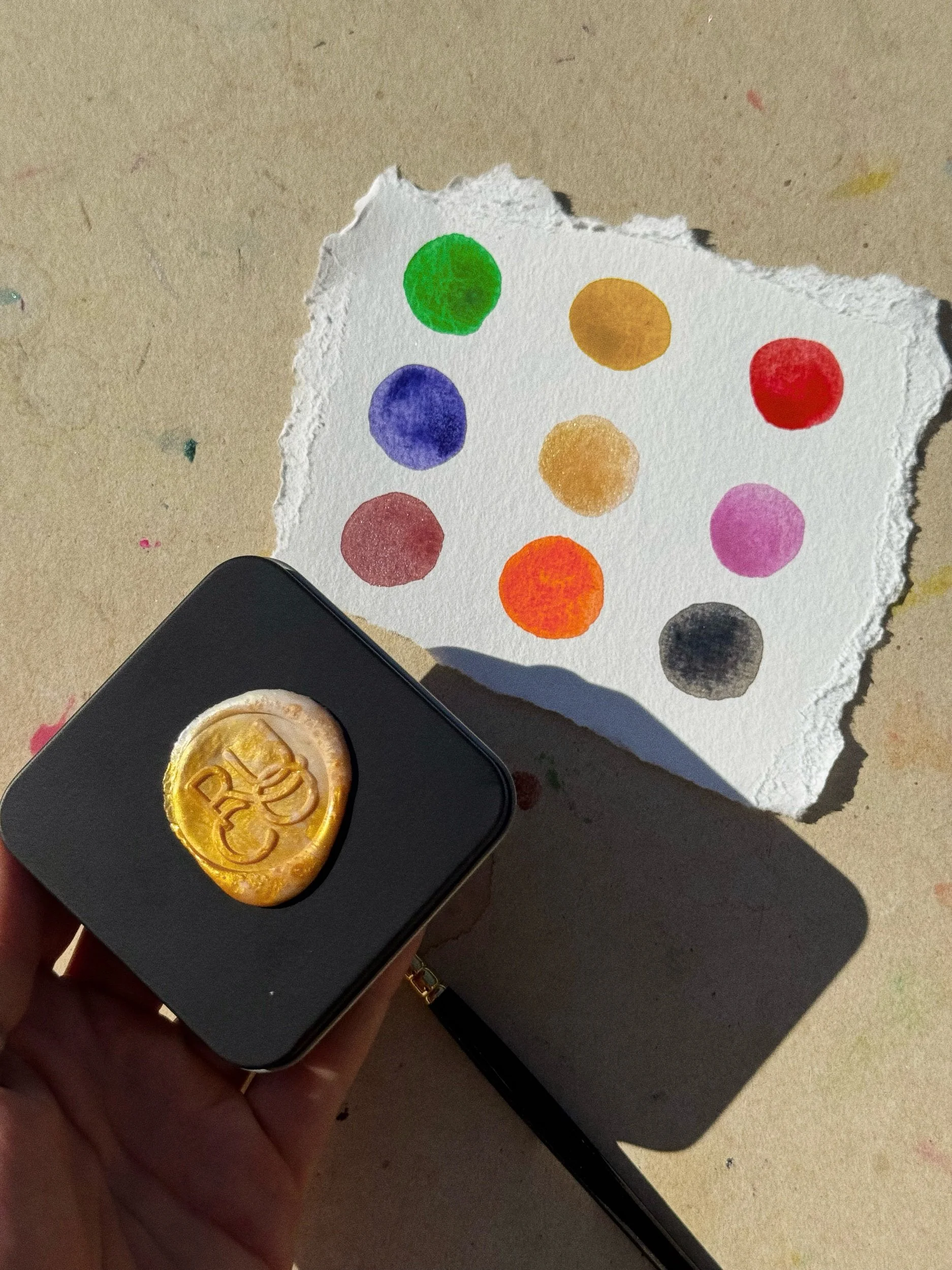 This small black metal tin features light beige ceramic pans filled with 9 handmade, vegan, watercolours from our Circus collection. The tin is sealed on top with a golden wax seal of our beautiful brand mark. Each set comes with a handmade textured cotton swatching card for you to test your new colours on. The pans are approximately mini sized and refillable.