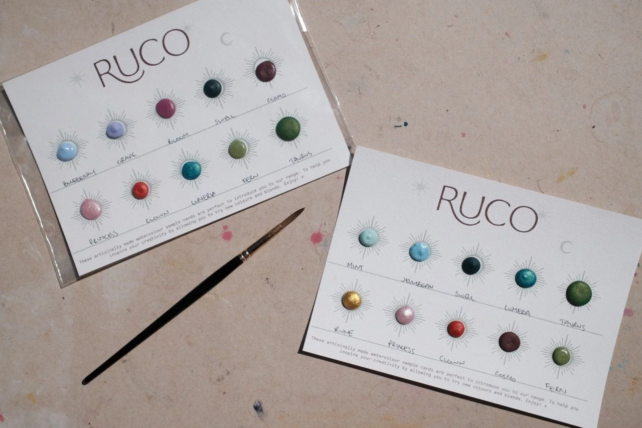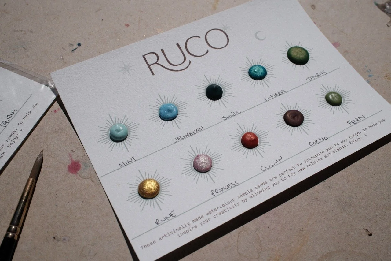 This set of 12 handmade white ceramic paint pots is filled with a curated selection of Blues from across the Ruco range. These are the very best of our blue hues ranging from mattes to shimmers, pastels to brights as well as some deep moody tones and separating granulators.